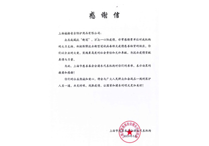 感謝信 上海市慈善基金會浦東代表機構