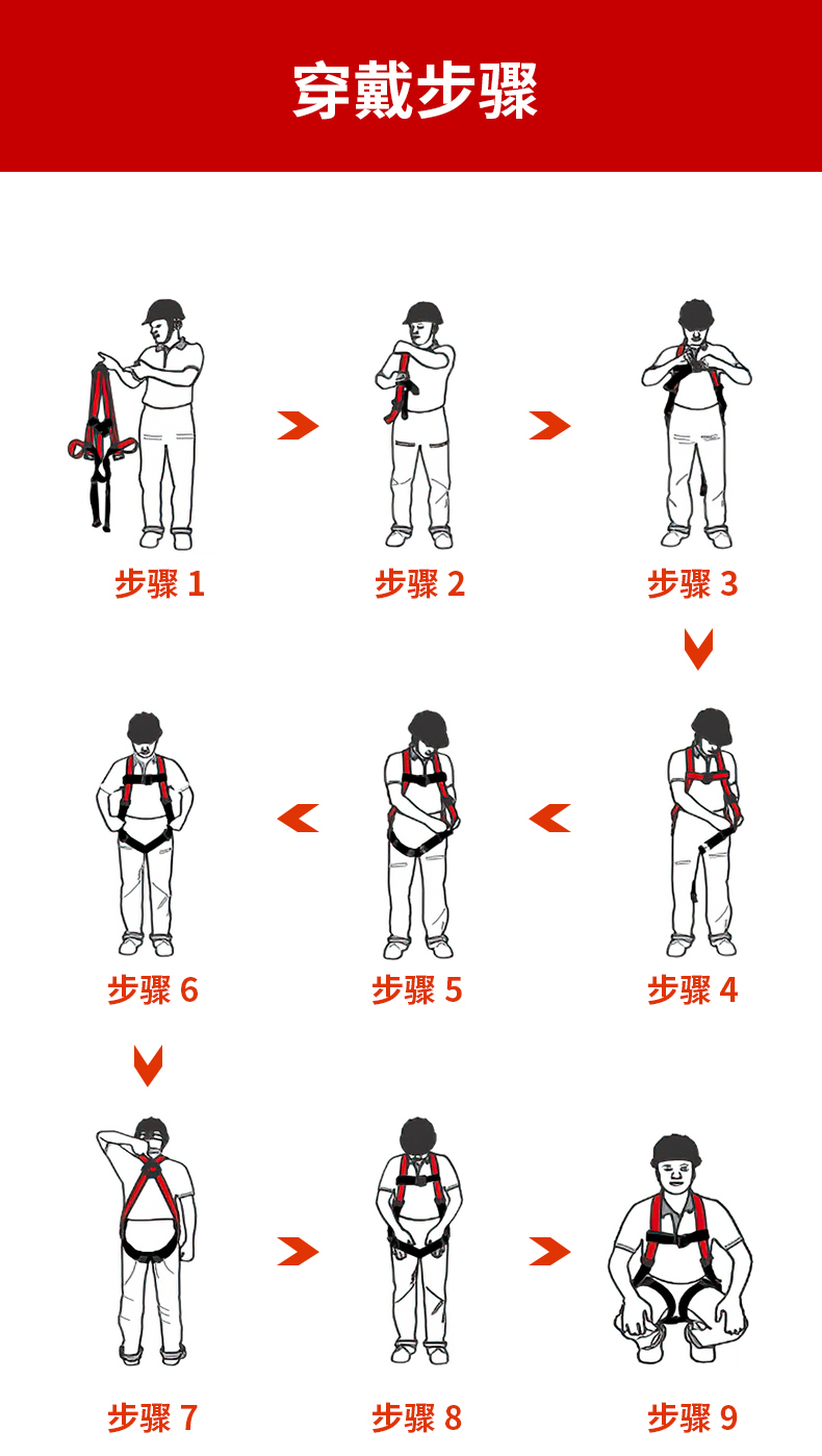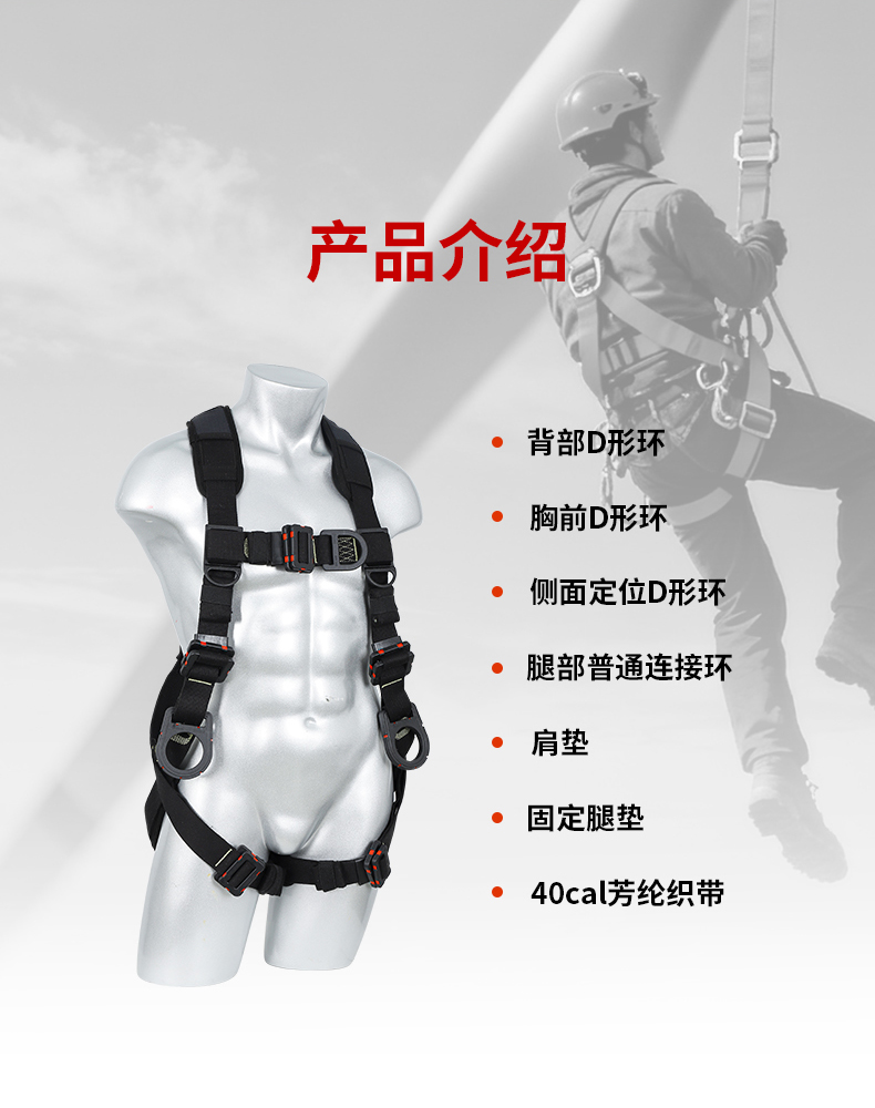 1、4個掛點:後背1個,胸(xiōng)前1個,腰部2個,2、5個調節點:腹,胸(xiōng),肩3、織帶(dài)材質:芳綸+合成纖維4、五金件:合金鋼+絕緣複合層5、調節扣:口日字6、帶護腰7、標準:GB6095-20218、適用:區域限製、